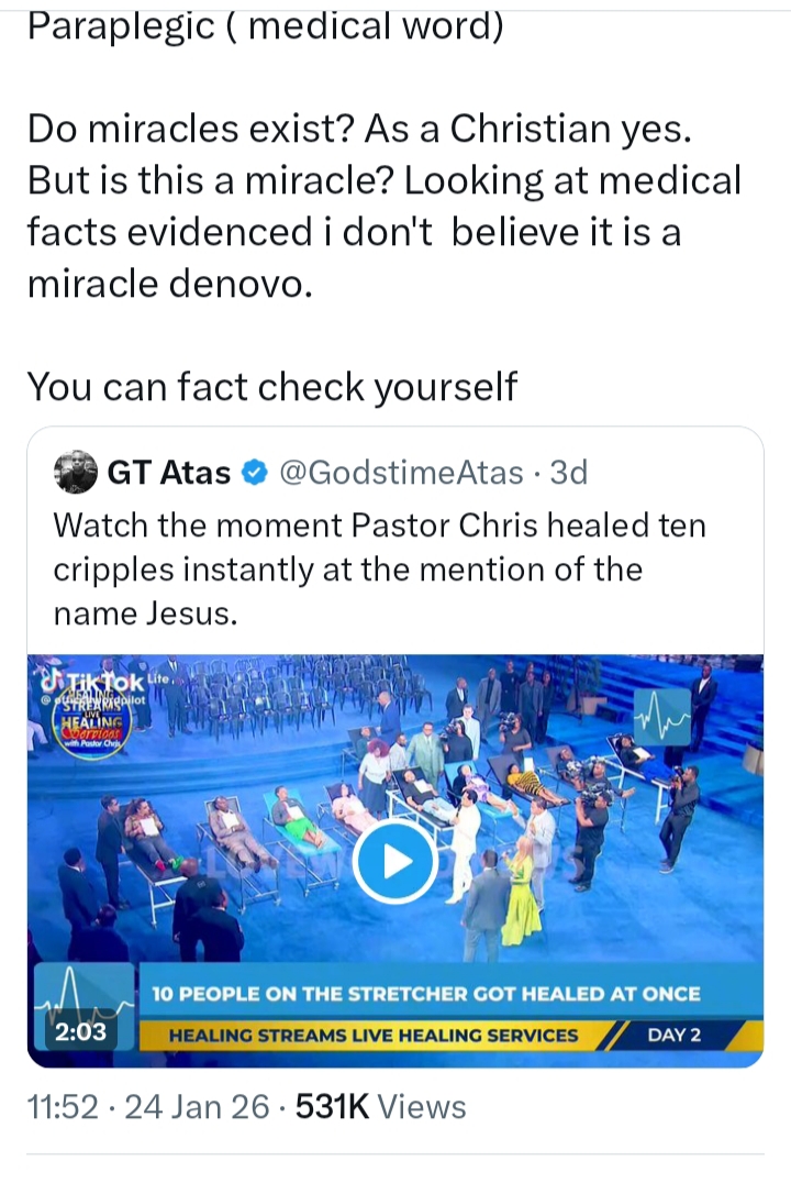 A Nigerian medical doctor, Dr Sina, has publicly reacted to a viral miracle video involving Pastor Chris Oyakhilome, stating that based on medical facts, he does not believe the incident qualifies as a miracle.