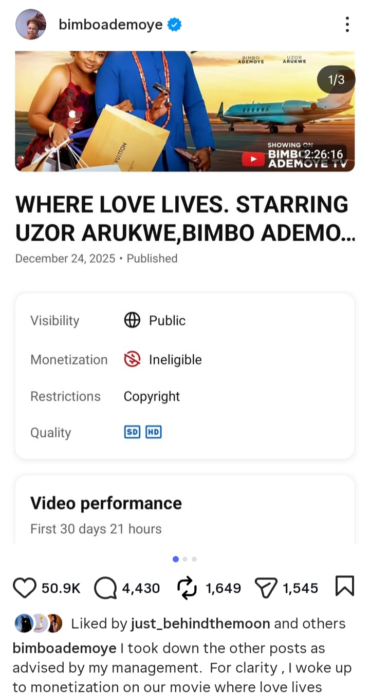 Nollywood actress Bimbo Ademoye has raised alarm over the alleged demonetisation of her movie Where Love Lives, accusing a man of unlawfully claiming ownership of a song used in the film.