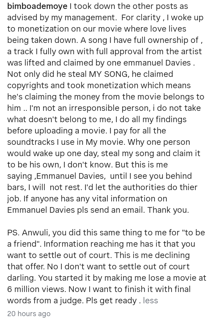 She also called out another alleged pirate, identified as Anwuli, claiming the person caused her to lose a separate movie that had amassed over six million views.