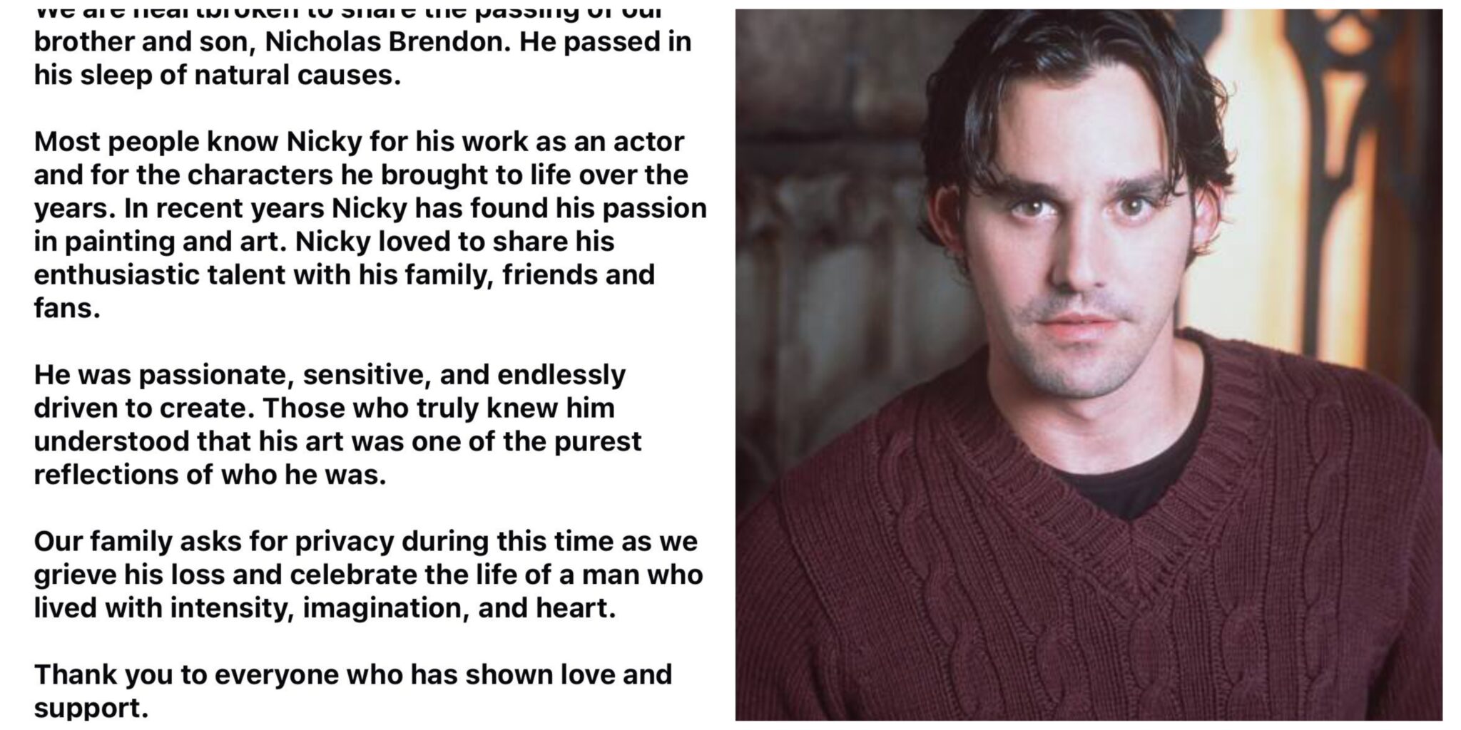 We are heartbroken to announce the death of our brother and son, Nicholas Brendon. He died of natural causes in his sleep.