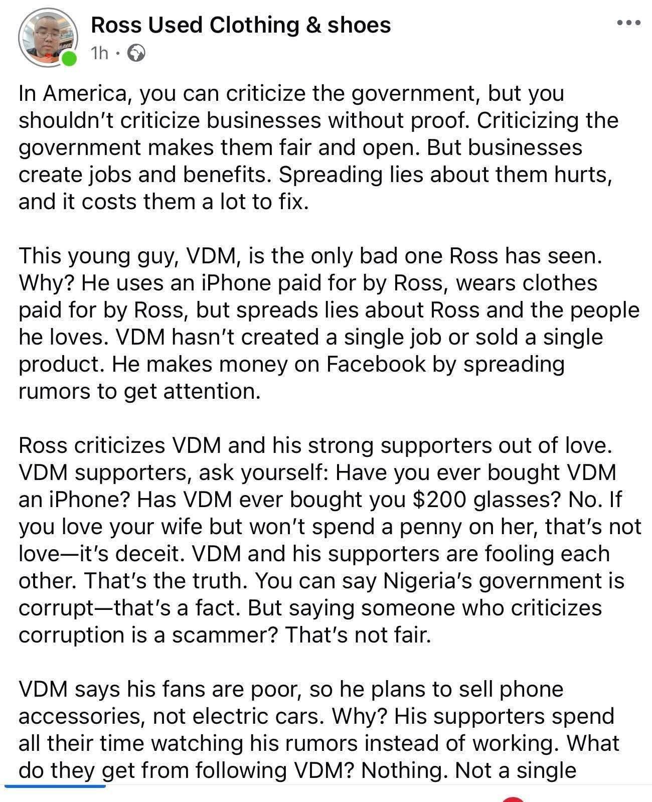 Ross criticizes VDM and his strong supporters out of love. VDM supporters, ask yourself: Have you ever bought VDM an iPhone? Has VDM ever bought you $200 glasses? No. If you love your wife but won’t spend a penny on her, that’s not love—it’s deceit. VDM and his supporters are fooling each other. That’s the truth. You can say Nigeria’s government is corrupt—that’s a fact. But saying someone who criticizes corruption is a scammer? That’s not fair.