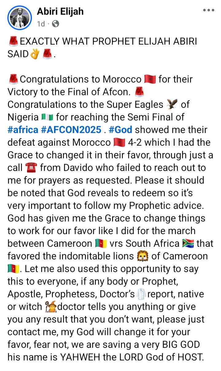 “EXACTLY WHAT PROPHET ELIJAH ABIRI SAID. Congratulations to Morocco for their Victory to the Final of Afcon. Congratulations to the Super Eagles of Nigeria for reaching the Semi Final of #africa #AFCON2025 . #God showed me their defeat against Morocco 🇲🇦 4-2 which I had the Grace to changed it in their favor, through just a call from Davido who failed to reach out to me for prayers as requested.
