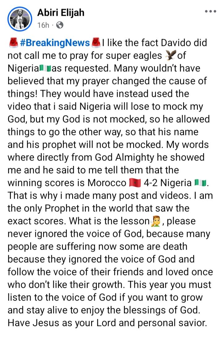 In his post, the prophet congratulated Morocco for advancing to the final and praised Nigeria for reaching the semi-finals. He also asserted that he accurately predicted the 4–2 penalty shootout result, attributing Nigeria’s loss to Davido’s failure to contact him as allegedly requested.