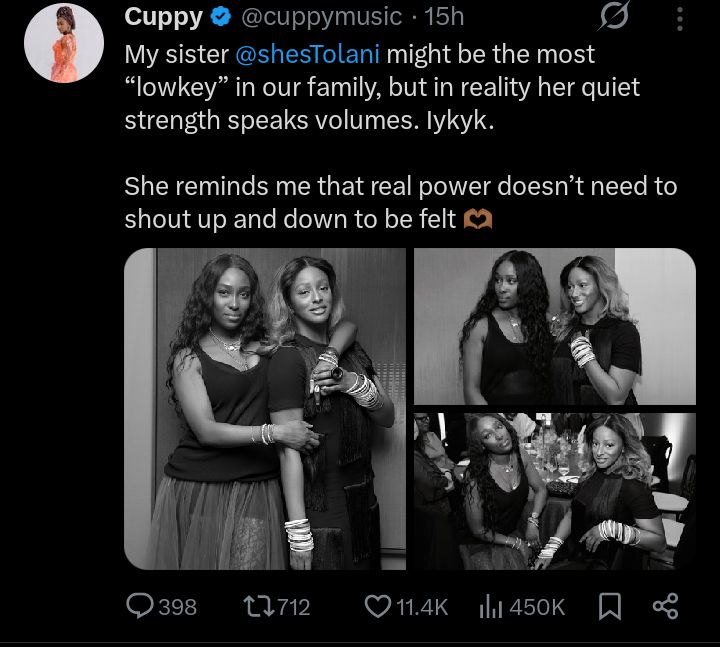 DJ Cuppy recently took to X (formerly Twitter) to share heartfelt words about Tolani, describing her as the most reserved member of their family but one whose presence speaks volumes.