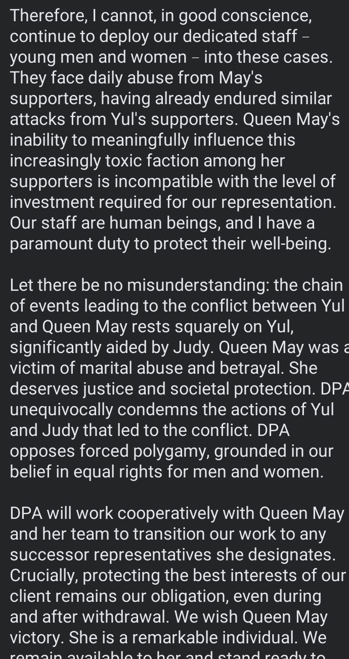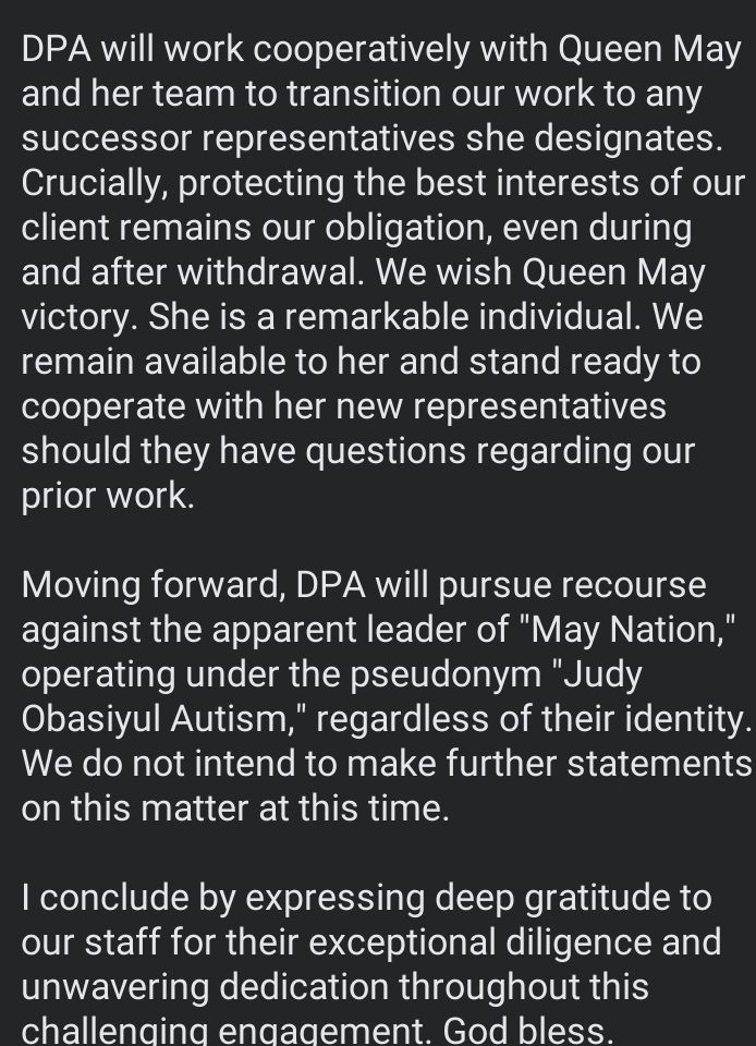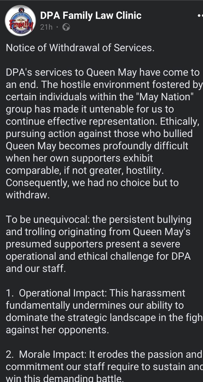 DPA’s services to Queen May have come to an end. The hostile environment fostered by certain individuals within the “May Nation” group has made it untenable for us to continue effective representation.
