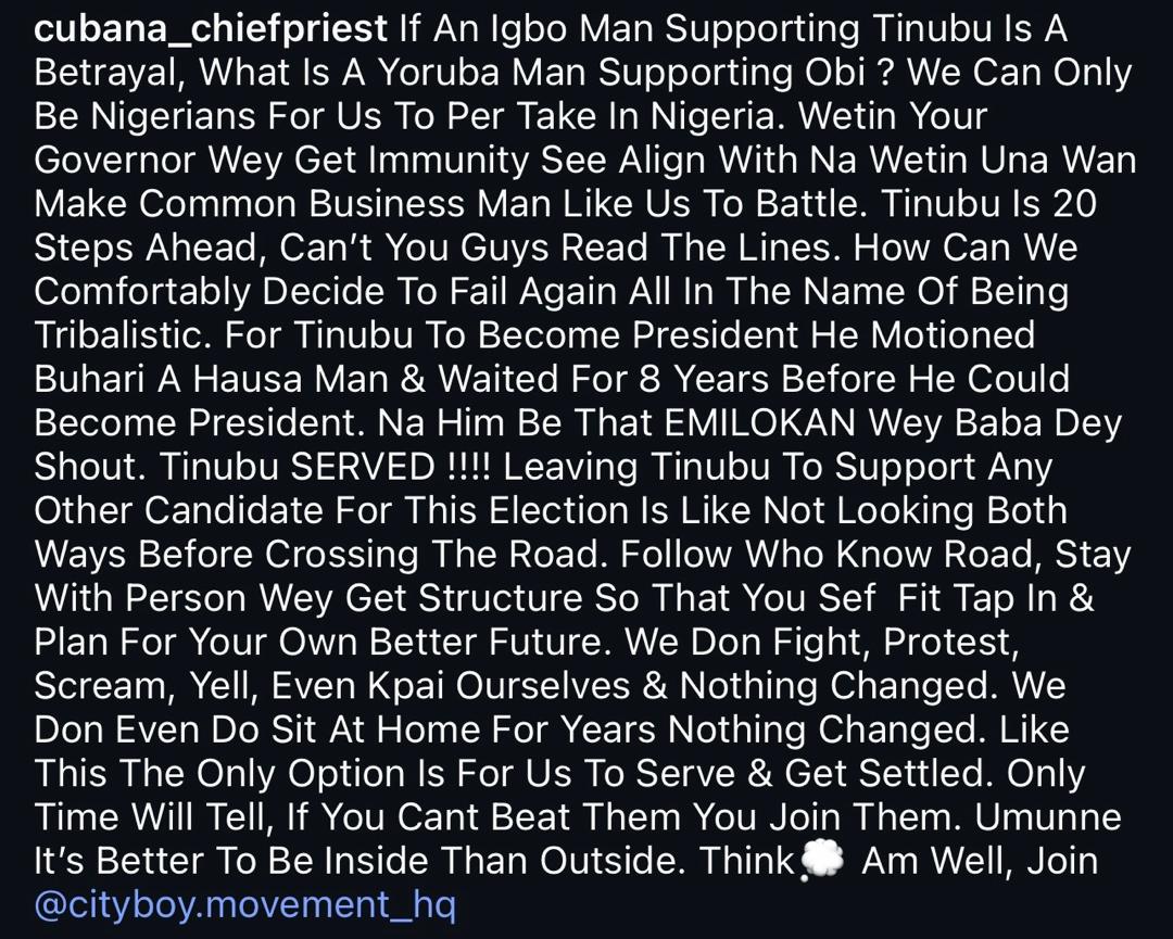 “If an Igbo man supporting Tinubu is a betrayal, what is a Yoruba man supporting Obi? We can only be Nigerians for us to prosper in Nigeria,” he wrote.