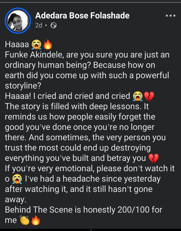 The lady identified as Adedera Bose Folashade on Facebook shared that the movie left her in tears.