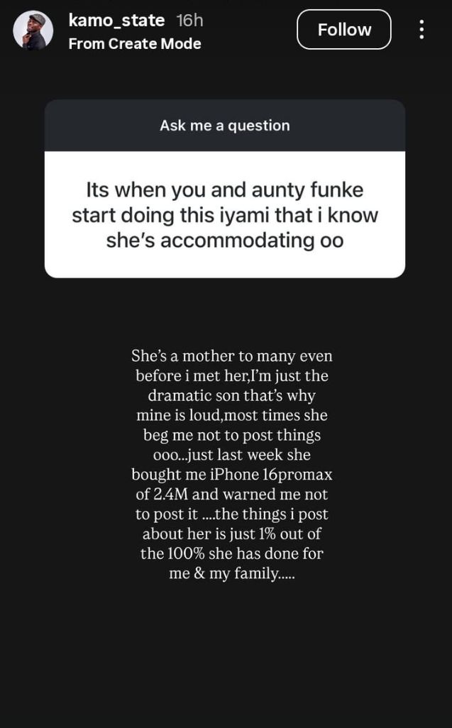 His post reads, “Funke Akindele is a mother to many, even before I met her. I am just the dramatic son; that’s why mine is loud. Just last week, she bought me an iPhone 16 PROMAX for N2.4M and warned me not to post it. The things I post about her are just 1% out of the 100% she has done for me and my family”.