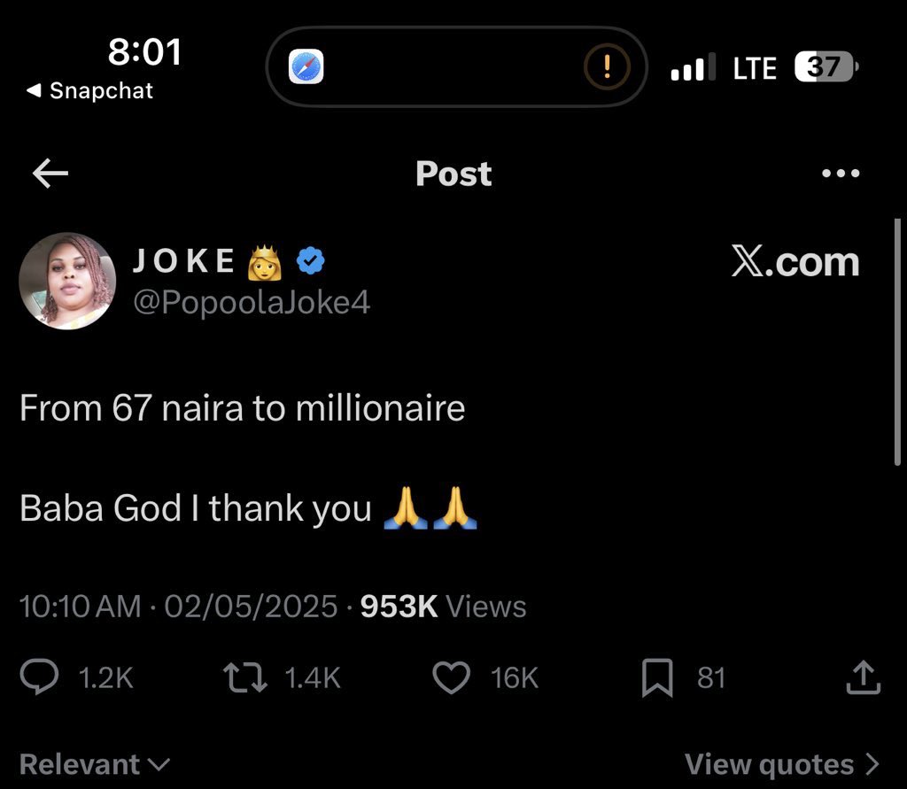 The lady known as @PopoolaJoke4 had taken to X to lament over her lack of funds, opining that she only had 67 Naira in her account.