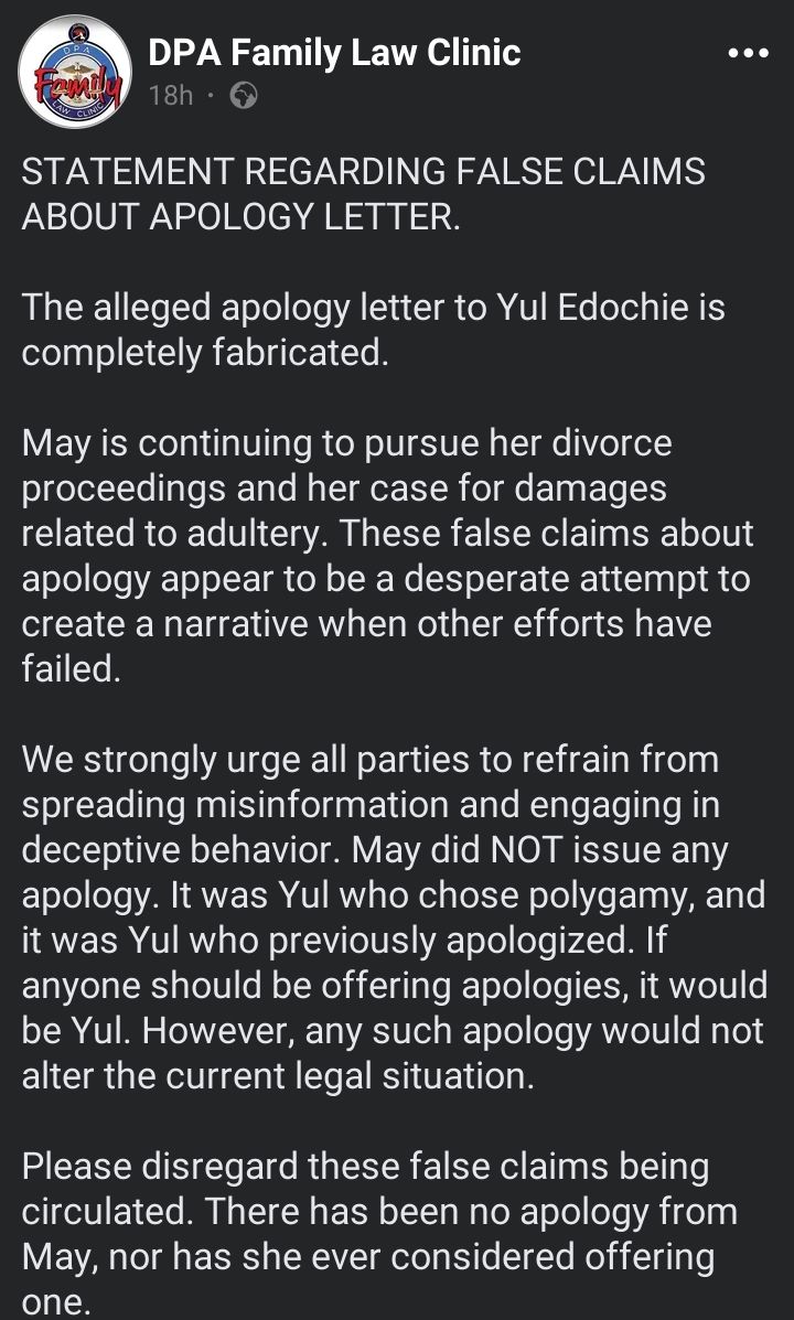 According to Ugwuonye, May is focused on pursuing her divorce and seeking damages for adultery.