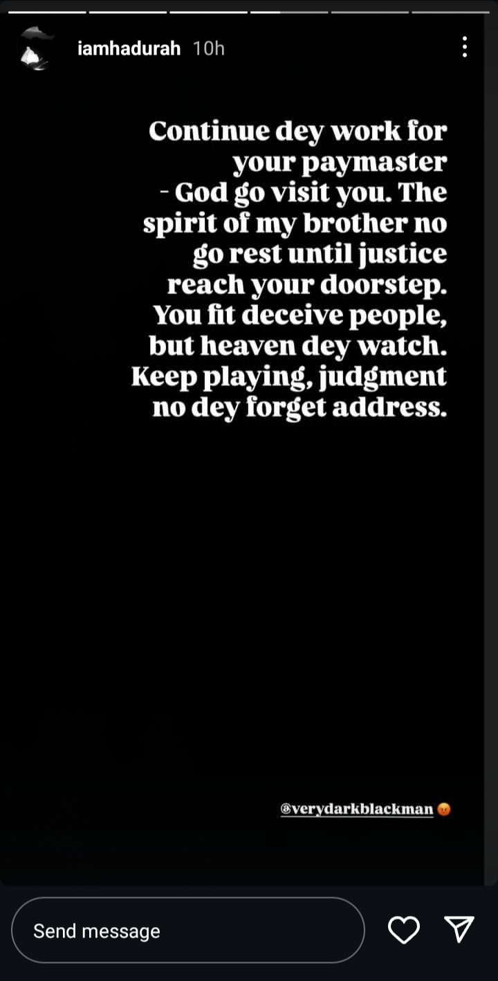 – God go visit you. The spirit of my brother no go rest until justice reach your doorstep. You fit deceive people, but heaven dey watch. Keep playing, judgment no dey forget address.