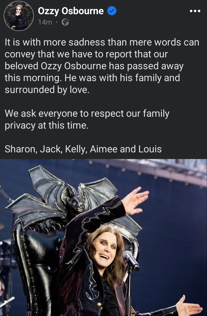 “It is with more sadness than mere words can convey that we have to report that our beloved Ozzy Osbourne has passed away this morning. He was with his family and surrounded by love”,The statement reads.