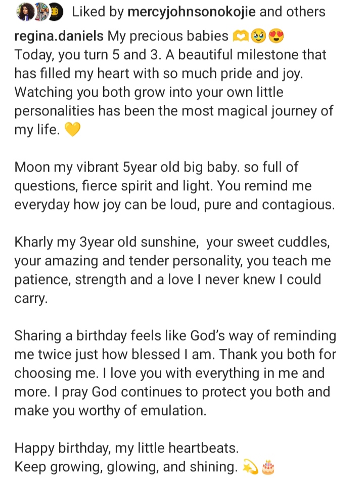 Actress Regina Daniels Nwoko joyfully marks the birthdays of her sons, Moon and Kharly, as they turn five and three.