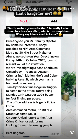 The message reportedly listed charges including criminal conspiracy, trespass, assault, intimidation, theft, and cyberbullying. Sammy, who shared a screenshot of the text via his Instagram story, appeared stunned by the tone and content of the invitation, which he described as unusual.