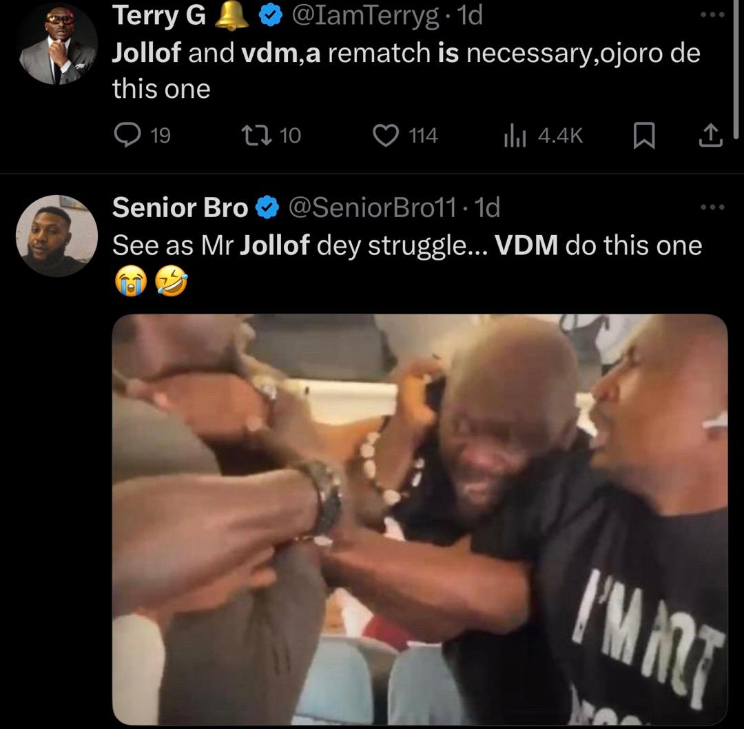 “Jollof and VDM, a rematch is necessary, ojoro de this one,” he wrote, suggesting that fans deserve a more conclusive and entertaining resolution to the viral incident.