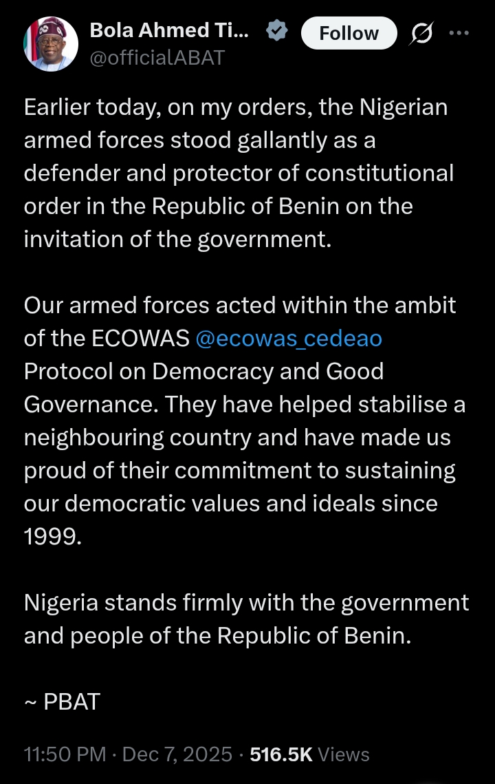 His response followed reports that loyalist forces in Benin, backed by Nigerian troops and air power, successfully dislodged mutinous soldiers who had earlier seized the national television station and declared the overthrow of President Patrice Talon.