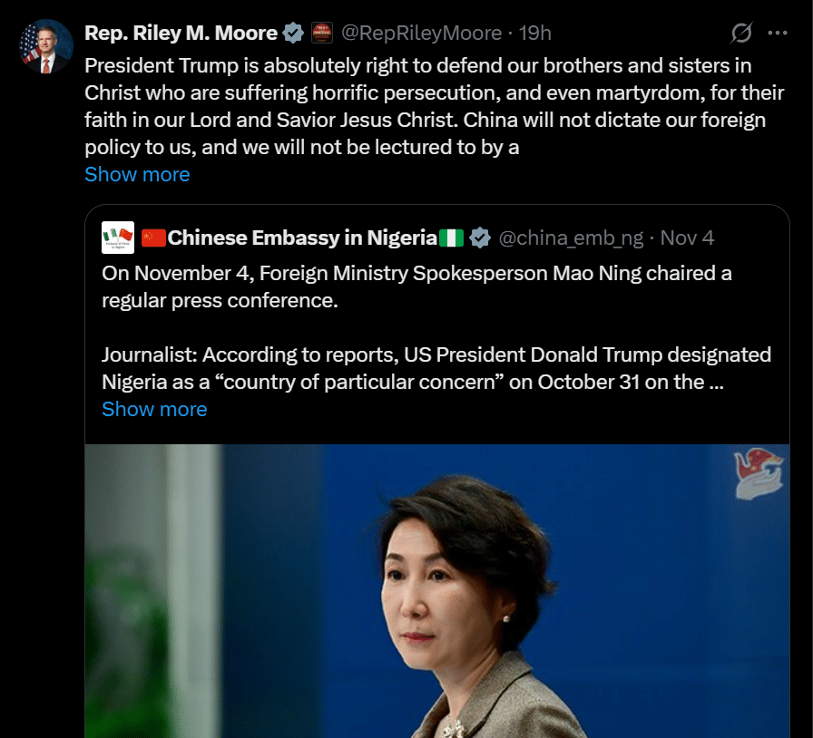 Moore’s remarks followed China’s condemnation of Trump’s statement, which the former president had framed as an effort to protect Christians facing persecution in Nigeria.