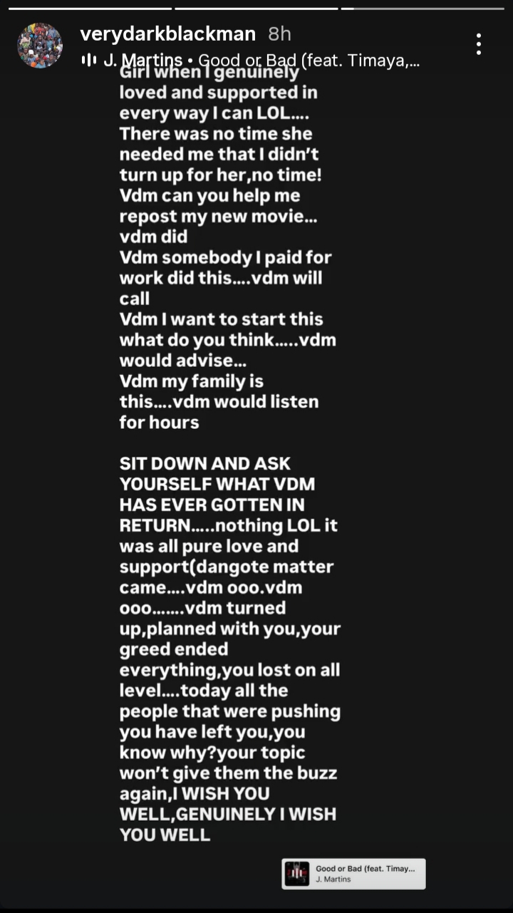 In a lengthy response shared publicly, VDM expressed disappointment, stating that his support for Phyna was genuine and consistent, with nothing expected in return.