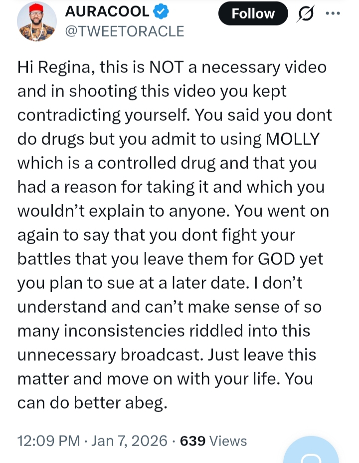 “Hi Regina, this is NOT a necessary video and in shooting this video you kept contradicting yourself. You said you dont do drugs but you admit to using MOLLY which is a controlled drug and that you had a reason for taking it and which you wouldn’t explain to anyone. You went on again to say that you dont fight your battles that you leave them for GOD yet you plan to sue at a later date. I don’t understand and can’t make sense of so many inconsistencies riddled into this unnecessary broadcast. Just leave this matter and move on with your life. You can do better abeg.”