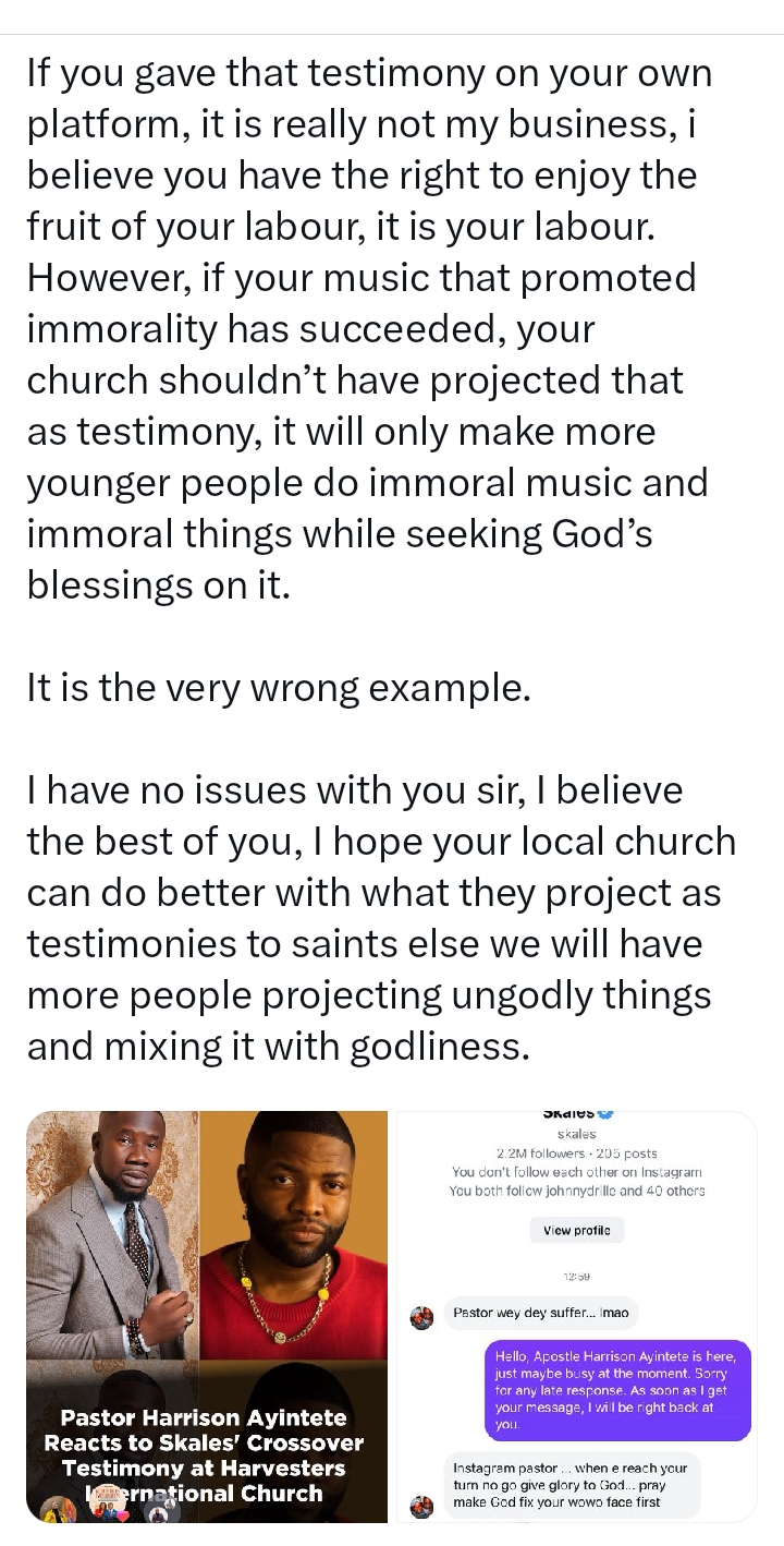 In a lengthy response, the cleric distanced himself from any personal dispute with the musician, stressing that his concerns were not directed at Skales as an individual but at the role of the church in projecting the testimony.