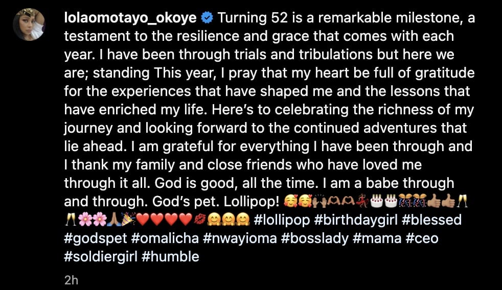 In her birthday message, Lola Okoye emphasized that turning 52 signifies more than just age; it represents a testament to her strength and the lessons learned throughout her life. She stated,