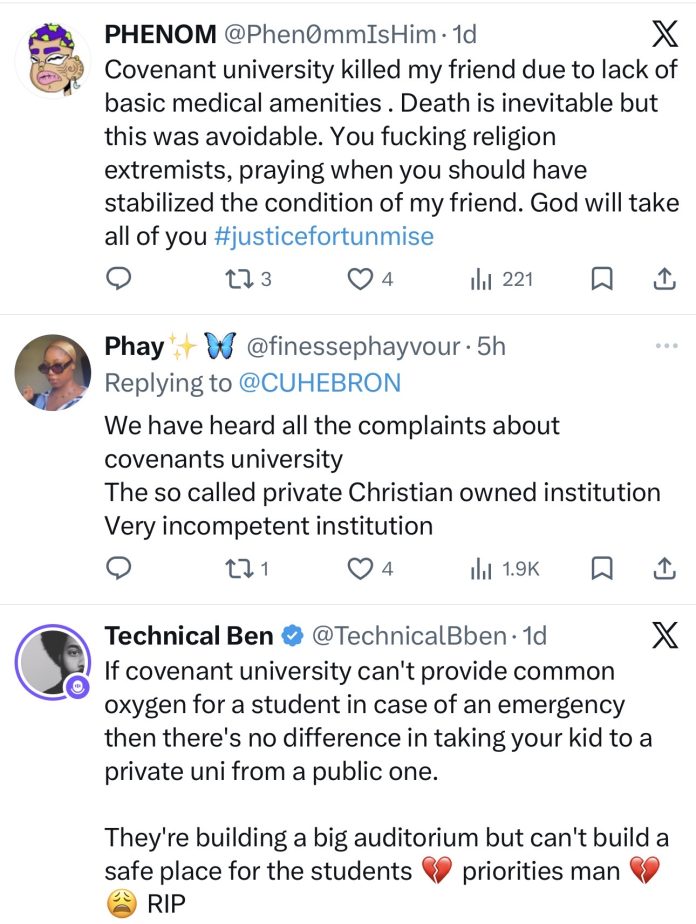 Sudents have, however, taken to social media to counter the school’s official account, accusing the University’s management of failing to provide basic medical care such as oxygen or nebulizers. Some students claimed that prayers were prioritised over urgent medical intervention and that pastors of the church ,joined in the prayers.