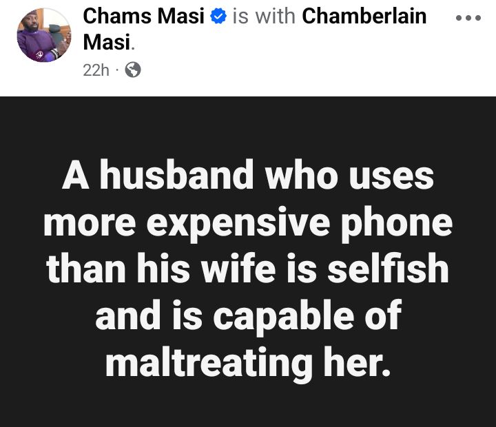 A Nigerian man, Chamberlain Masi, has stated that a husband who uses more expensive phones than his wife is selfish and capable of maltreating the woman.