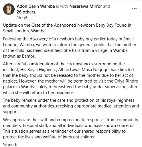 “The baby remains under the care and protection of his royal highness and community authorities, receiving appropriate medical attention and support.