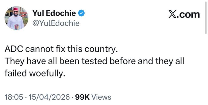 In a shared on Wednesday, April 15, Yul opined that the ADC consists of a group of politicians who have ‘failed woefully and cannot fix Nigeria.’ According to him, the men in the opposition party have been in power before and did not make any impact.