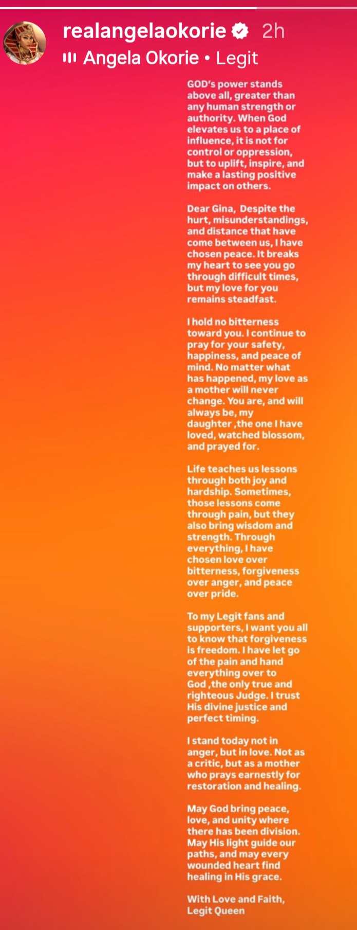 “Dear Gina, despite the hurt, misunderstandings. and distance that have come between us, I have chosen peace. It breaks my heart to see you go through difficult times, but my love for you remains steadfast.