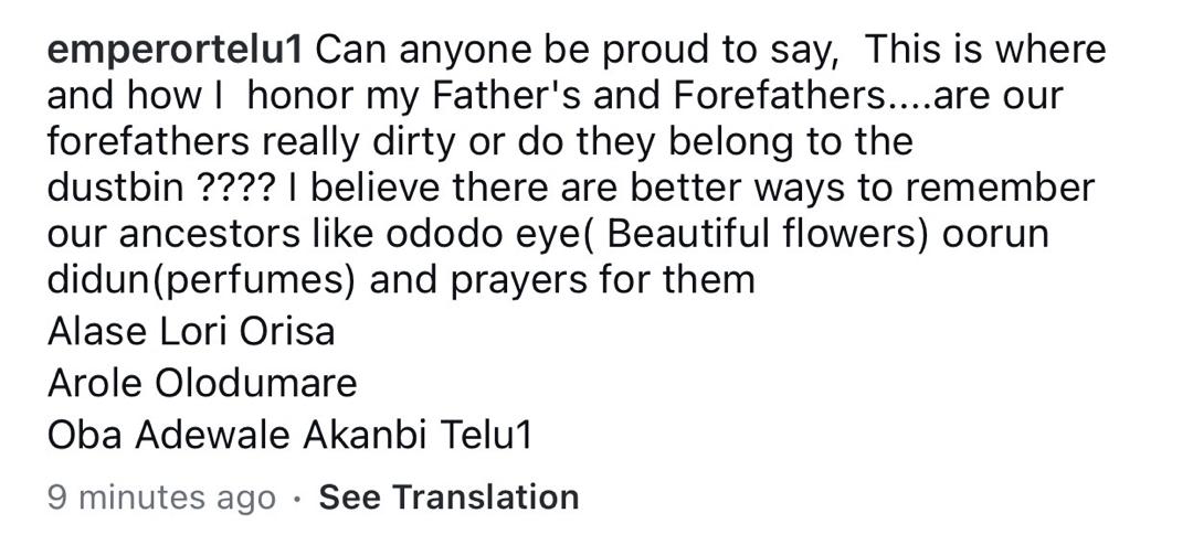 ‘’Can anyone be proud to say, This is where and how I honor my Father’s and Forefathers….are our forefathers really dirty or do they belong to the dustbin ???? I believe there are better ways to remember our ancestors like ododo eye( Beautiful flowers) oorun didun(perfumes) and prayers for them