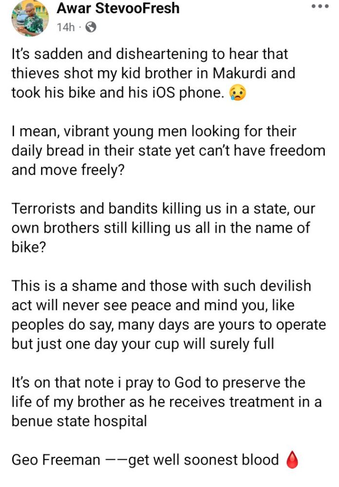 According to him, his younger sibling, Geo Freeman, was attacked by assailants who shot him before making away with his bike and iOS phone.
