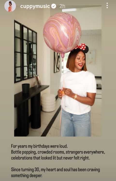 “For years my birthdays were loud. Both popping, crowded rooms, strangers everywhere, celebrations that looked lit but never felt right. Since turning 30, my heart and soul has been craving something deeper” she wrote.