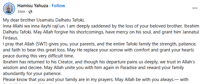 The deceased was the younger brother of Rt. Hon. Shehu Dalhatu Tafoki, Member of the House of Representatives representing Kankara–Faskari–Sabua Federal Constituency, and a son of Tafoki traditional leader Alhaji Dalhatu Tafoki.