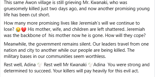 This same Awon village is still grieving Mr. Kwanaki, who was gruesomely k!lled just two days ago, and now another promising young life has been cut short.