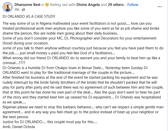 A popular disc jockey, DJ Orlando, is receiving treatment in a hospital after allegedly being attacked at a wedding in Otukpo, Benue State following a disagreement over extra payment.