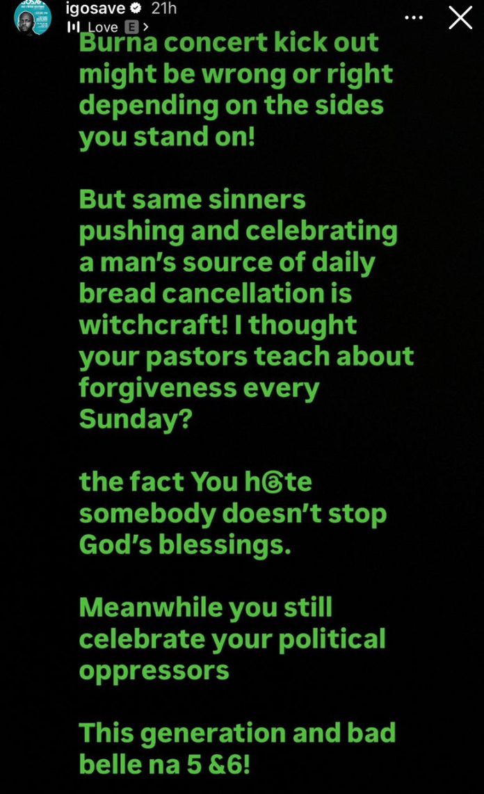 In a post shared on Instastories, I Go Save knocked people celebrating the cancellation and equated their actions to ‘’witchcraft.”
