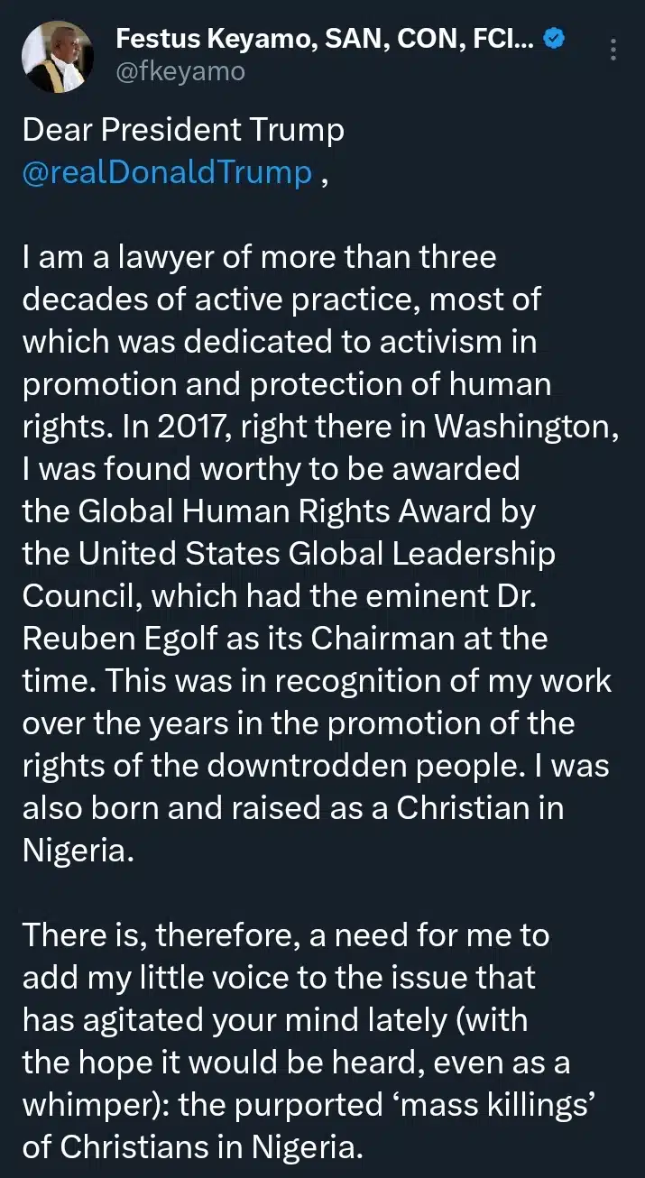 Nigerias Minister of Aviation and Aerospace Development, Festus Keyamo, has directly refuted claims made by US President Donald Trump alleging mass or targeted k!llings of Christians in Nigeria.In an open letter posted on X on Wednesday, November 5, the Minister insisted that such accusations do not reflect the realities in the country and instead sought Trumps cooperation to confront terror!sm.Keyamo, a Senior Advocate of Nigeria and long-standing human rights lawyer, appealed to Trump to deepen collaboration with Nigeria in the fight against terror!sm rather than rely on what he described as inaccurate external narratives.Keyamo, who noted he was born and raised as a Christian, reminded President Trump of his decades-long activism, including receiving the Global Human Rights Award in Washington in 2017.He strongly pushed back against the international allegations: It is simply not true that Christians are being specifically targeted in Nigeria for persecution, k!llings, or harassment on account of their faith. He added, It would have been unconscionable for me to serve in any government that targets Christians.The Minister explained that the violence Nigeria faces stems from extremist and criminal groups like Boko Haram, armed herdsmen, and cattle rustlers. He stressed that these security challenges predate the current administration and have affected citizens of all religious backgrounds.Keyamo defended the federal governments commitment to religious tolerance and the Nigerian Constitution, stating: “Nigeria is a secular state,” which “guarantees freedom of religion and prohibits the adoption of a state religion.”Regarding Government Composition, he highlighted that President Bola Ahmed Tinubu, despite being Muslim, is widely regarded as a moderate leader with strong ties to the Christian community; his wife is a pastor in a major Pentecostal church, and many of his children are practicing Christians.Furthermore, Keyamo pointed out that many of the Service Chiefs appointed by the President are Christians, arguing it would be illogical to claim they were complicit in any faith-based killings. He concluded by urging Trump and the U.S. government to seek more balanced information on Nigeria and collaborate with the Nigerian government to tackle the long-standing problems of terror!sm and insurgency.”We ask that you broaden your sources of information to gain a balanced view of events in Nigeria, he wrote, calling for strengthened bilateral ties and reaffirming Nigerias commitment to peace.   Dear President Trump @realDonaldTrump , I am a lawyer of more than three decades of active practice, most of which was dedicated to activism in promotion and protection of human rights. In 2017, right there in Washington, I was found worthy to be awarded the Global Human Rights Festus Keyamo, SAN, CON, FCIArb (UK) (@fkeyamo) November 5, 2025   The post Claims of targeted k!lling of Christians in Nigeria are false Festus Keyamo says in open letter to Trump appeared first on Linda Ikeji Blog.
