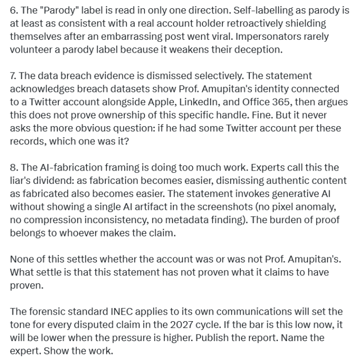 Babátúndé didn’t make a definitive claim that the account belonged to Prof. Amupitan, but insisted INEC had not met the standard it claimed. “None of this settles whether the account was or was not Prof. Amupitan’s. What it settles is that this statement has not proven what it claims to have proven,” he wrote.