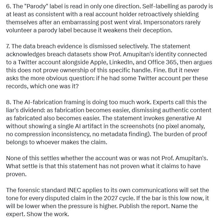 He added that INEC’s reading of the account’s “Parody” label was too one-sided. “Self-labelling as parody is at least as consistent with a real account holder retroactively shielding themselves after an embarrassing post went viral. Impersonators rarely volunteer a parody label because it weakens their deception,” he wrote.