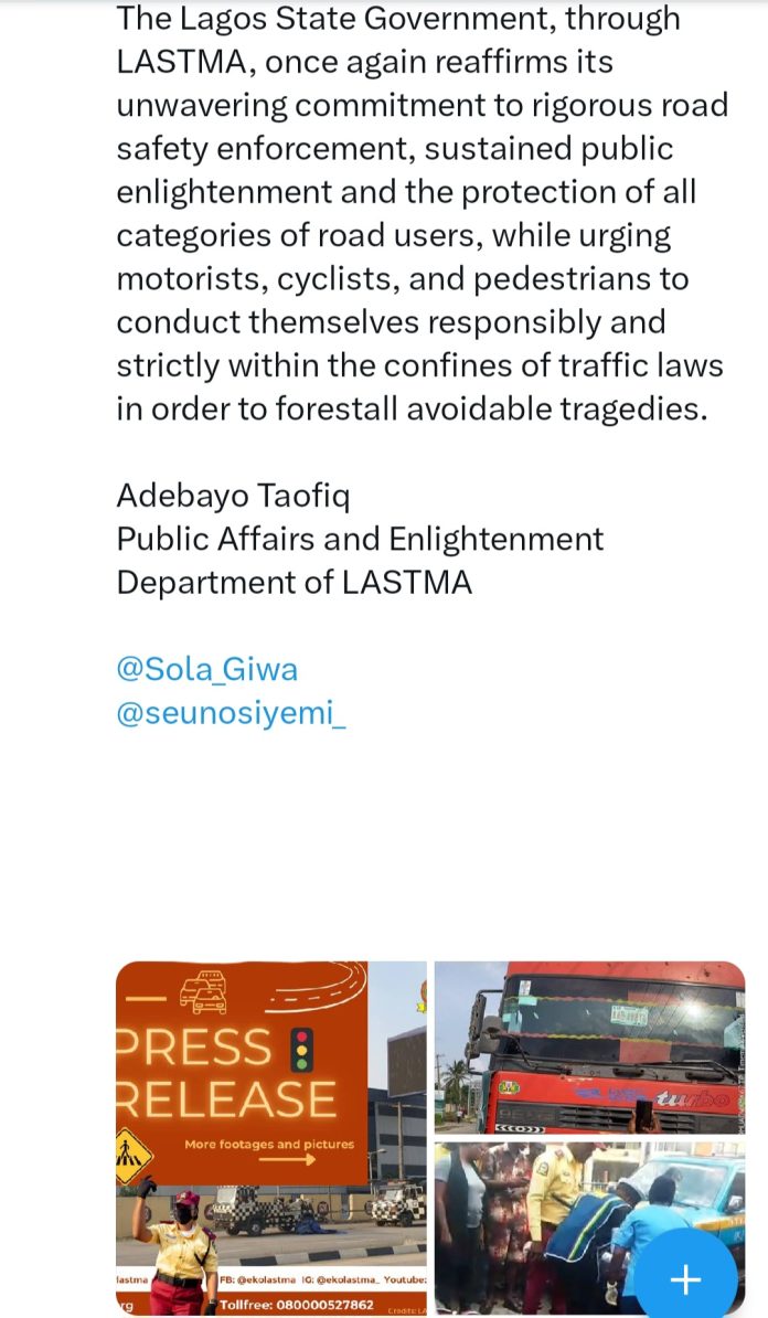 A cyclist was k!lled Monday, Feb. 9, after a collision with a DAF articulated truck in Ikeja, Lagos State. The incident occurred under the Lagos State University Teaching Hospital Bridge at the traffic signal corridor along Airport Road, according to the Lagos State Traffic Management Authority. A statement issued via X by LASTMAs Public Affairs and Enlightenment Department head, Adebayo Taofiq, stated that both the cyclist and the truck were coming from the Maryland axis when the cyclist failed to maintain a safe distance from the heavy-duty vehicle. The statement read: Preliminary security findings reveal that the tragic episode unfolded as both the cyclist and the heavy-duty truck, advancing from the Maryland axis, simultaneously attempted to negotiate the roundabout underneath the bridge. In the course of this perilous convergence, the cyclist was reportedly unable to maintain a safe clearance from the moving truck. Within a matter of moments, the situation escalated disastrously, resulting in the cyclist being violently crushed and succumbing to fatal injuries on the spot. Taofiq said LASTMA operatives at the scene swiftly intercepted the truck driver, who had attempted to flee the scene. The suspect was thereafter handed over to security personnel from the Ikeja Police Division for thorough investigation and prosecution in line with extant laws. He added that officials from the State Environmental Health Monitoring Unit (SHEMU) were called to remove the deceased cyclist, ensuring traffic flow and public safety. Special Adviser to the Governor on Transportation, Sola Giwa, expressed sorrow over the incident and extended condolences to the family of the deceased. He urged cyclists and commercial motorbike riders to exercise caution and strictly adhere to traffic regulations, warning against plying highways and major roads where their risk of accidents is higher.