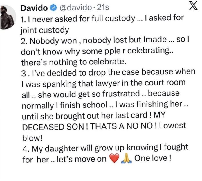 In a post shared on his X handle this evening, Davido pointed out that no one won in this case and that the only person who lost is Imade. He mentioned that he has dropped the case and that Imade will grow up knowing that he fought for her.