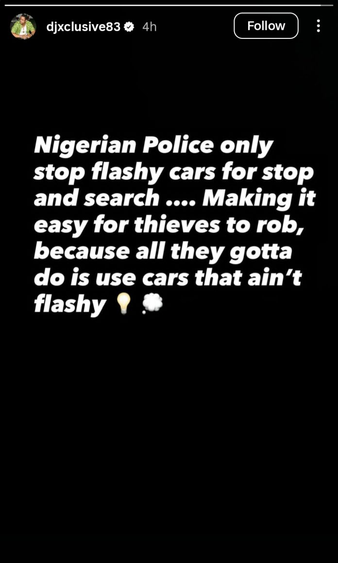 He wrote: “Nigerian Police only stop flashy cars for stop and search… Making it easy for thieves to rob, because all they gotta do is use cars that ain’t flashy.”
