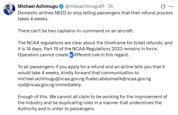In a post shared on his X handle today October 13, Achimugu said the law stipulates that the domestic airline are to make refunds to passengers in 14 days and not four weeks which they always say.