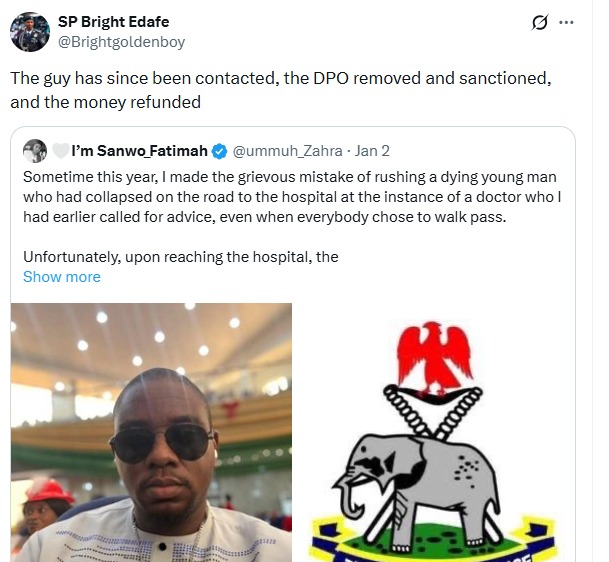 Reacting vai X, the spokesperson of the command, SP Bright Edafe, said the DPO has been sanctioned and removed from office. The money extorted from the victim has since been refunded.