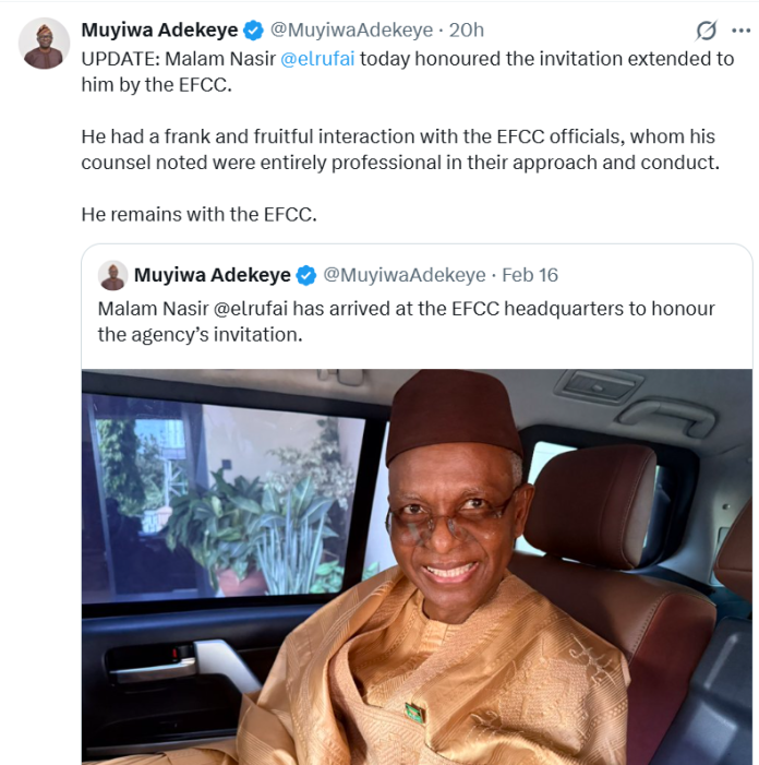 In the post, Adekeye wrote: “UPDATE: Malam Nasir @elrufai today honored the invitation extended to him by the EFCC. He had a frank and fruitful interaction with the EFCC officials, whom his counsel noted were entirely professional in their approach and conduct. He remains with the EFCC.”