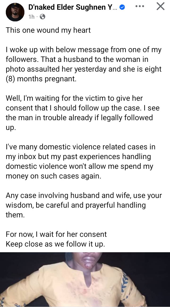“This one wound my heart. I woke up with below message from one of my followers. That a husband to the woman in photo assaulted her yesterday and she is eight (8) months pregnant,” he wrote