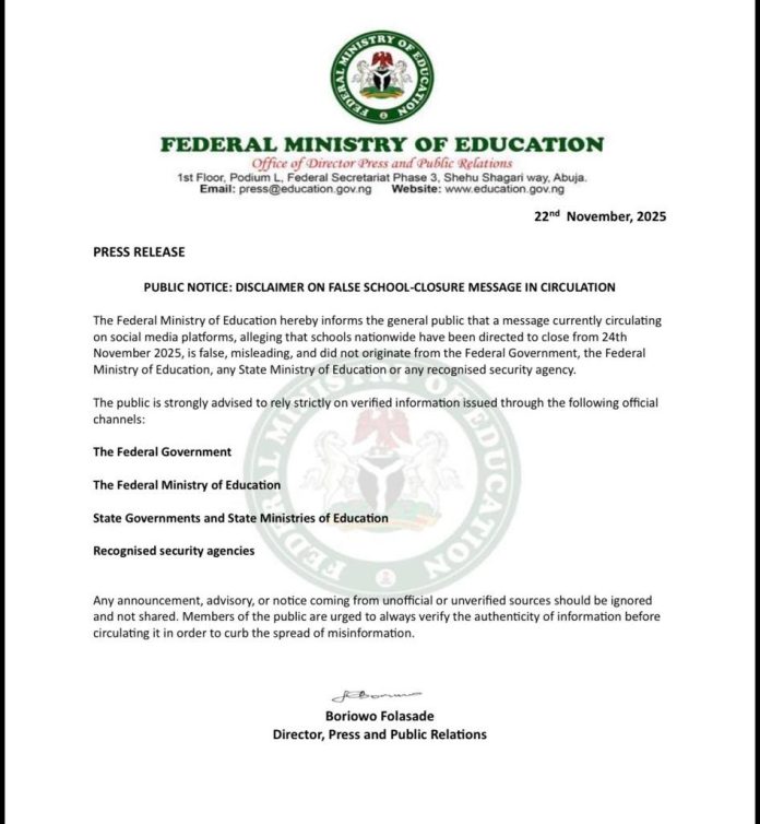 The Federal Ministry of Education has denied issuing a circular ordering the closure of schools nationwide following the recent abductions of pupils.