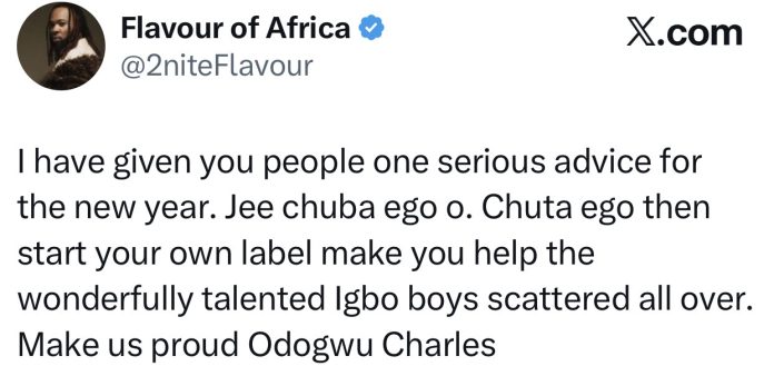 Singer Flavour has clapped back at an X-user who accused him of refusing to sign young and talented Igbo singers just because he doesn’t want them to outshine him.