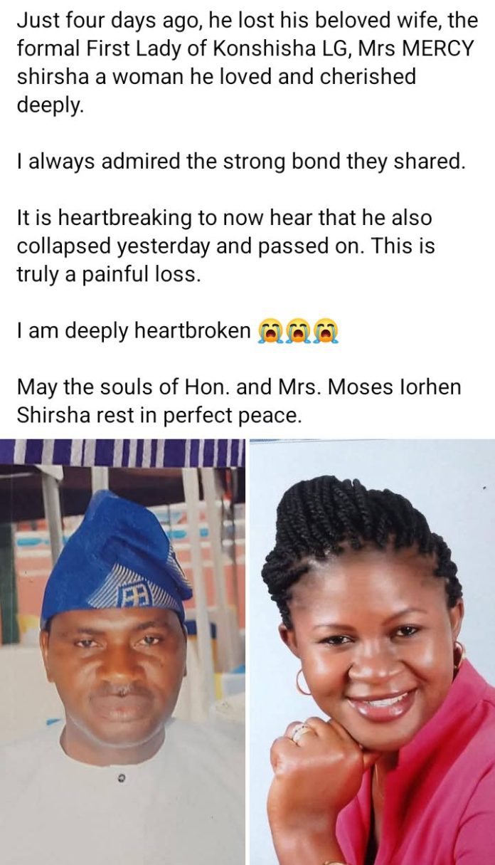 Former chairman of Konshisha Local Government Area of Benue State, Hon Moses Shirsha, has d!ed four days after the d3ath of his wife, Mercy Mngu.